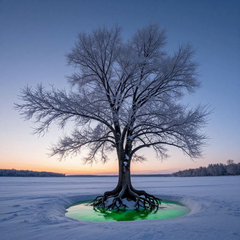 Solitary tree stands majestically in a snowy expanse, its frost-covered branches reaching skyward while its exposed roots cradle a luminous green pool, reflecting the twilight hues of the horizon.