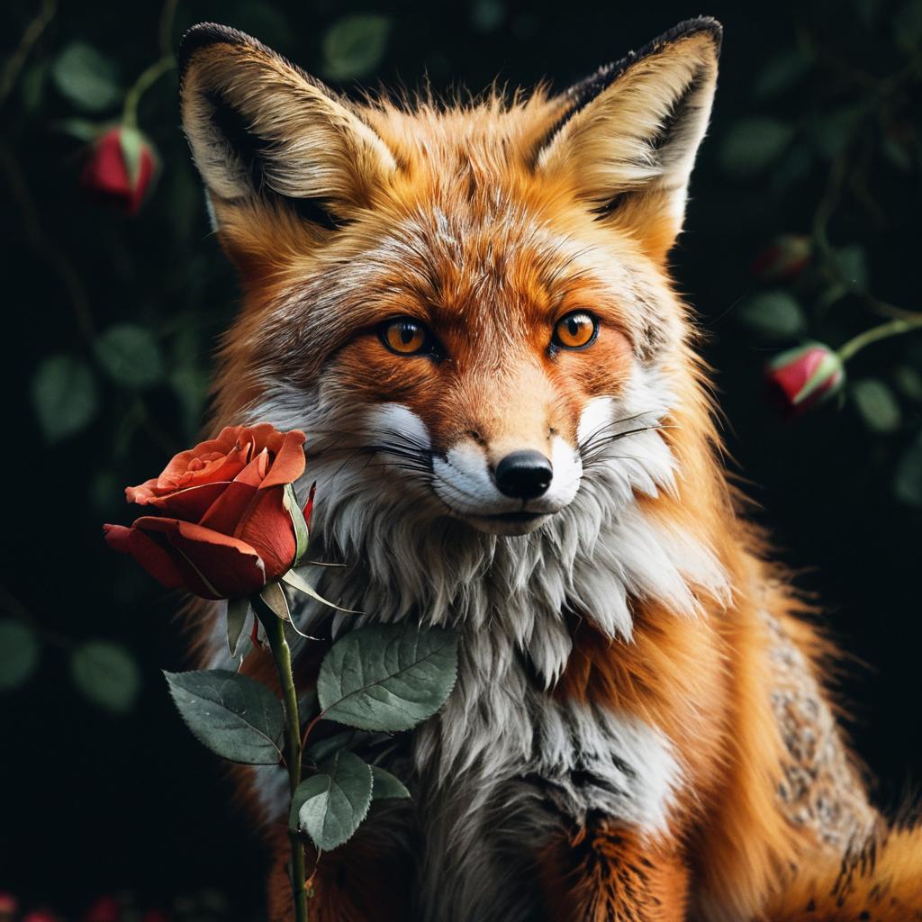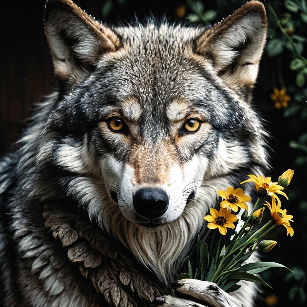 Badger holding bouquet, with furry and highly detailed features. The badger has a curious expression, with intricate detailing on both the fur and the stem and thorns. The scene captures a contemplative atmosphere with a focus on texture and detail, creating a lifelike, expressive portrayal.