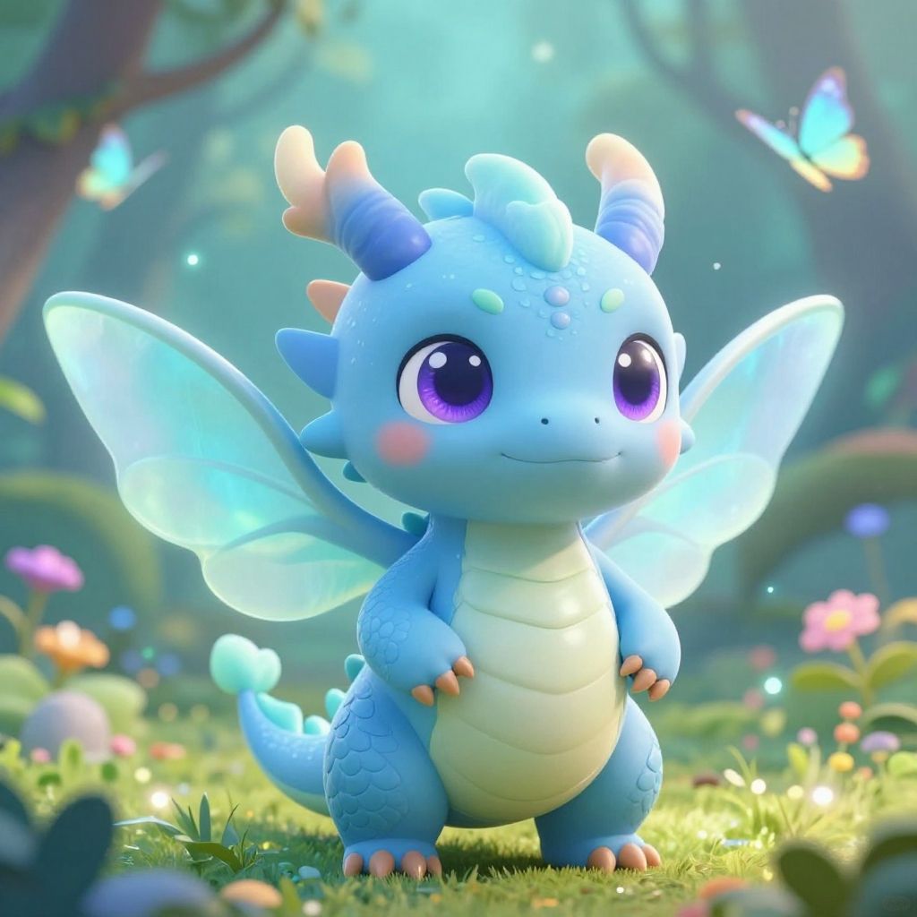 A 3D rendered illustration of a cute blue fantasy dragon with large purple eyes, small horns, and fairy-like translucent wings. The dragon has a soft, rounded body with green scales on its belly and tiny orange claws. It is surrounded by a glowing magical forest environment with butterflies and plants in the background.