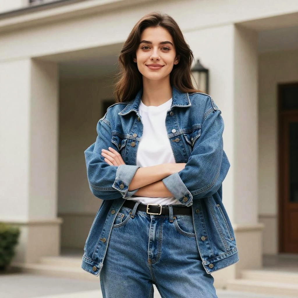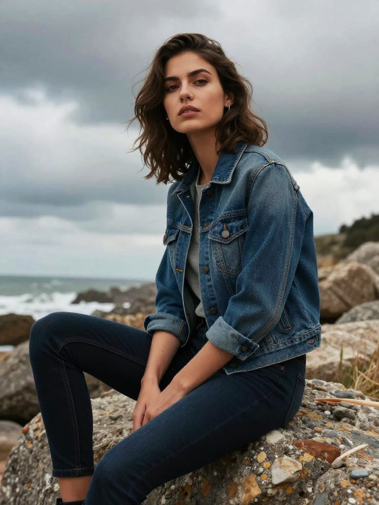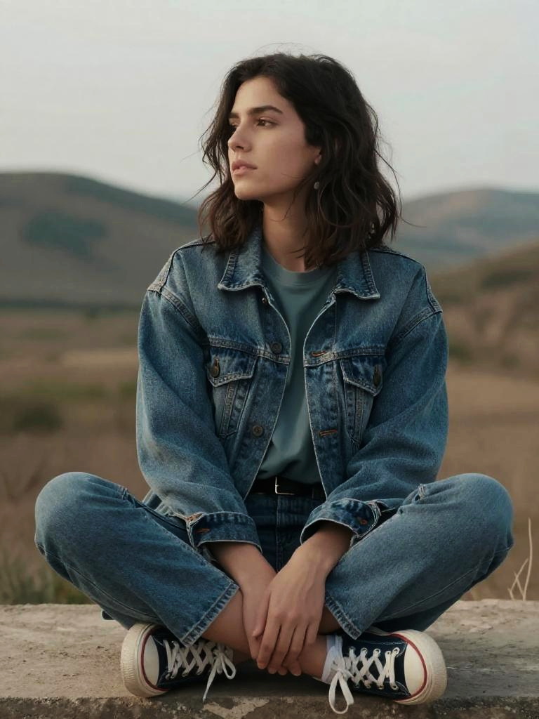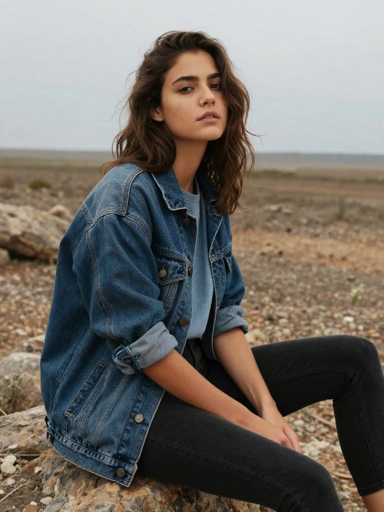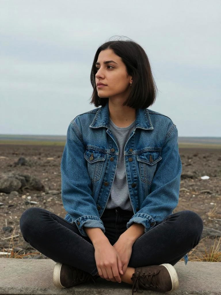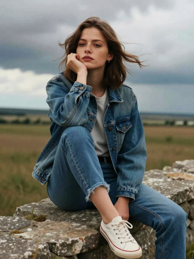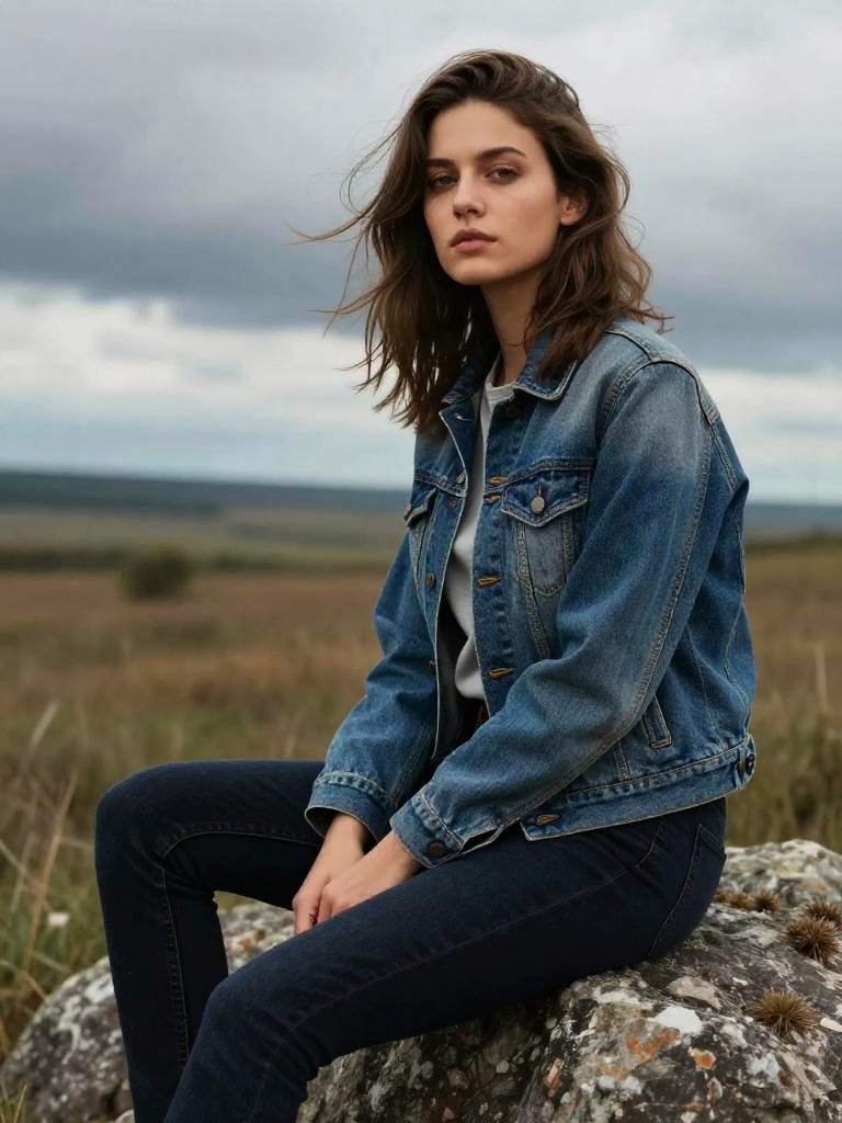 Woman wearing denim t-shirt, moody outdoor portrait of a young woman in a denim jacket and jeans, freckled woman with chin-length hair tucked behind ear dressed in faded denim jacket paired with mid-wash jeans and canvas sneakers sitting seated sideways on the rock, hands clasped loosely in lap in windswept field with distant horizon and moody clouds, cinematic natural light, overcast sky, high resolution