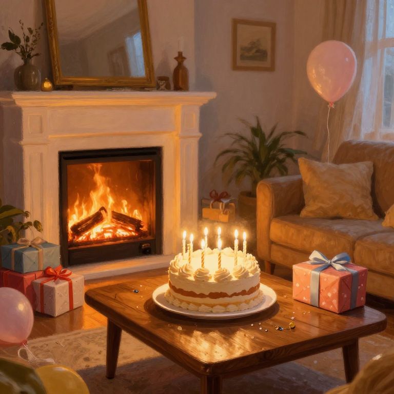 Birthday scene featuring a cozy living room with a glowing fireplace, a big cake topped with candles on a wooden table, wrapped presents and balloons scattered around, warm lighting and a feeling of togetherness and happiness in a painterly style