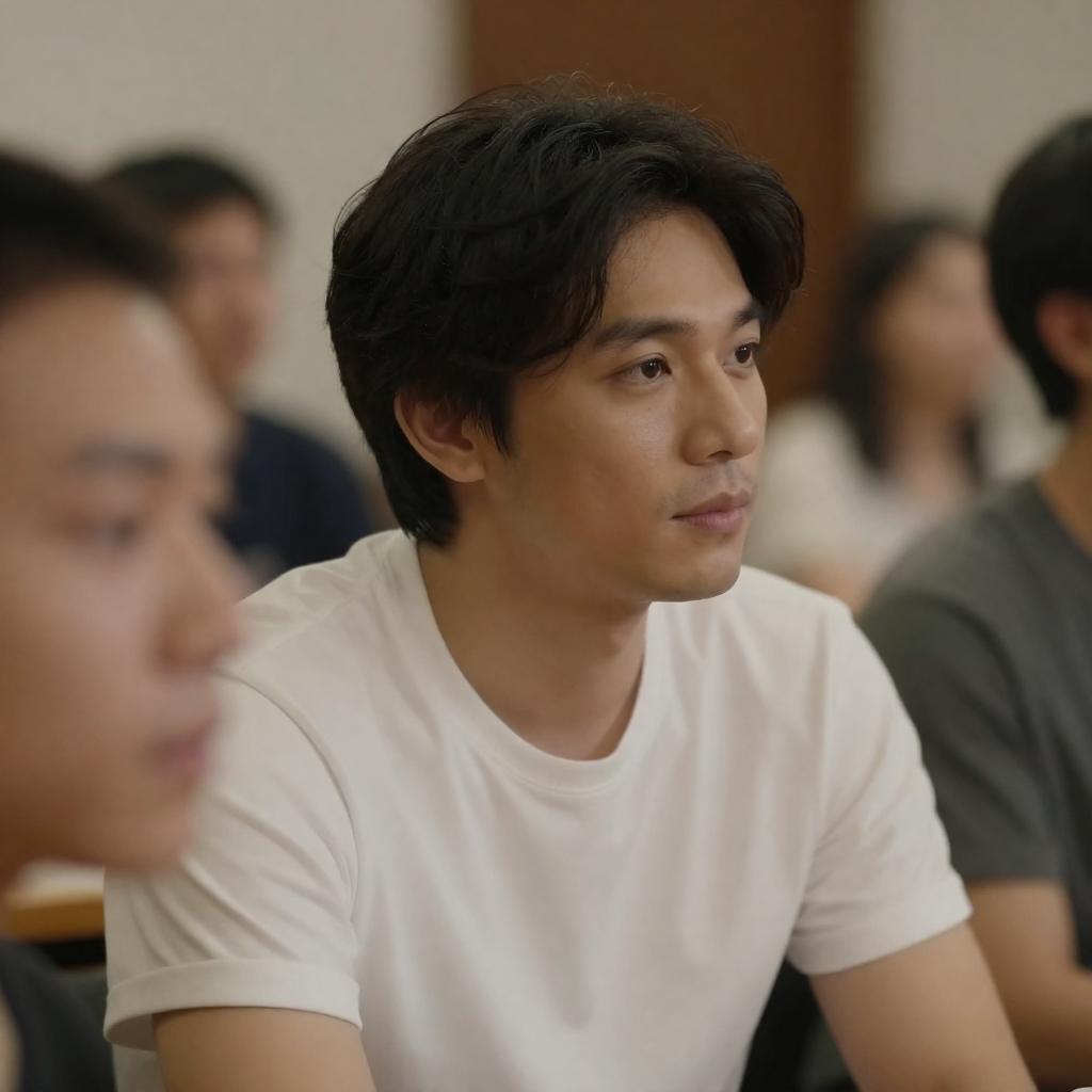 Photograph of a man with short, curly dark hair, light skin, wearing a light blue shirt, holding his left hand to his ear, looking intently to the right. Another person with short, dark hair is partially visible in the background.