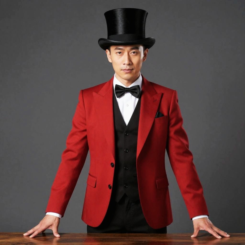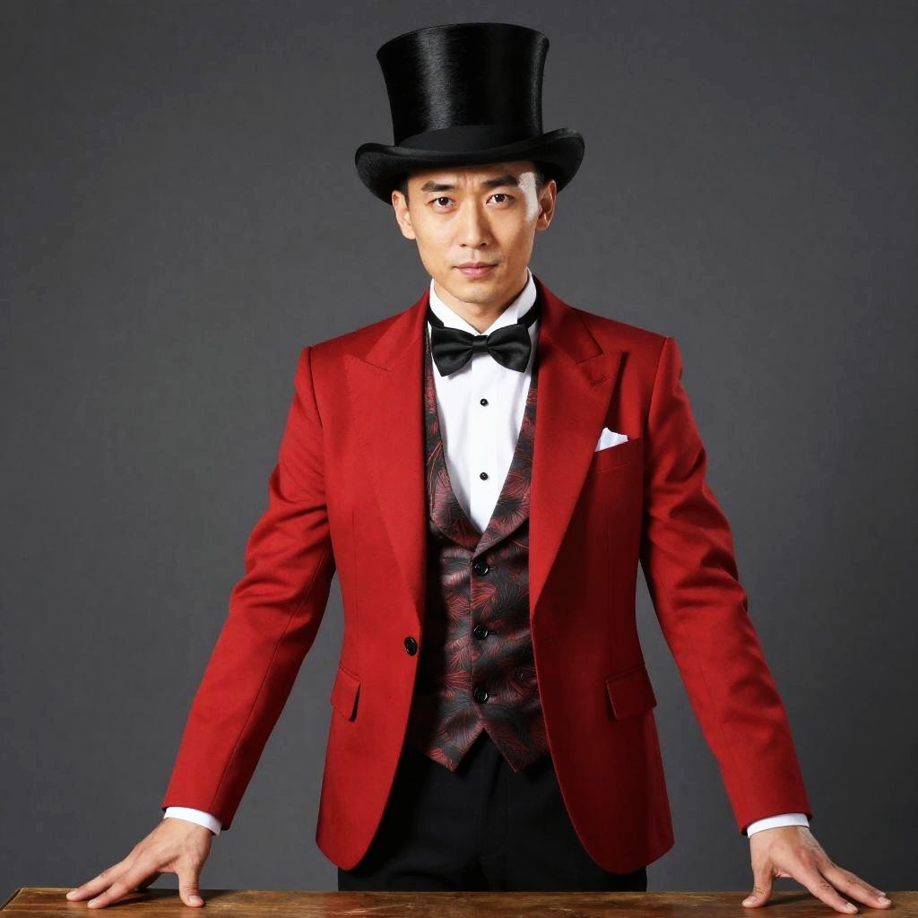 A confident Asian man wearing a formal magician outfit, including a red jacket, patterned vest, white dress shirt, black bow tie, and a tall black top hat, standing behind a wooden table against a gray background.