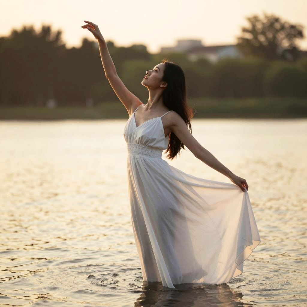 Graceful dancer wearing a lavender prairie dress, standing in a moonlit rooftop terrace