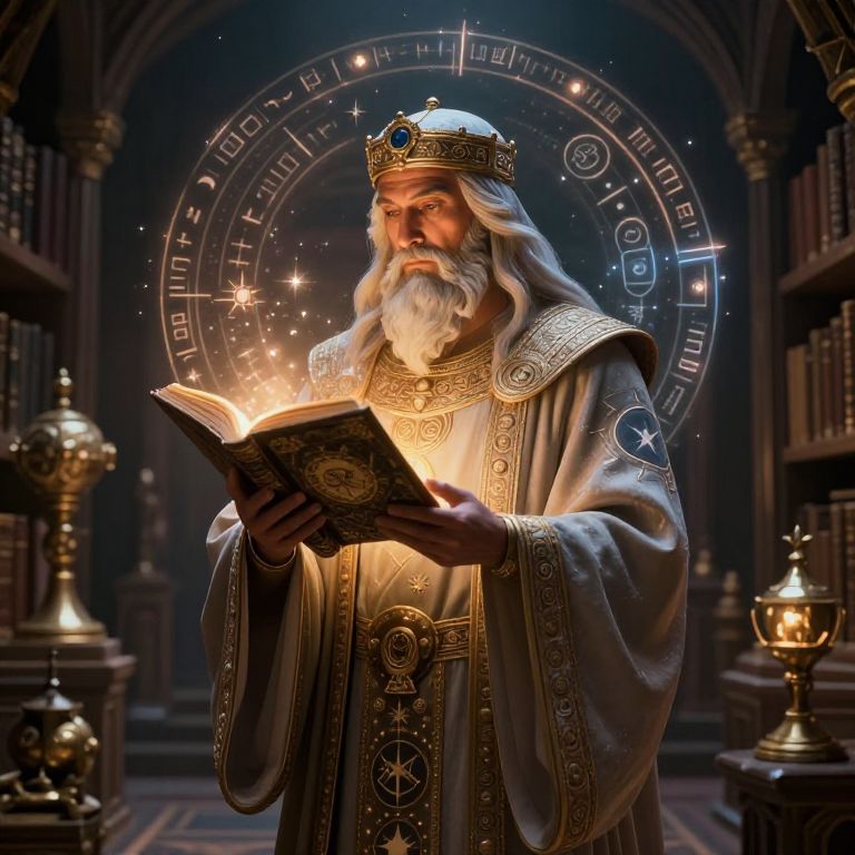 Robed figure holding a glowing staff in a magical library filled with floating books, warm golden light, intricate robe patterns, fantasy illustration with rich details