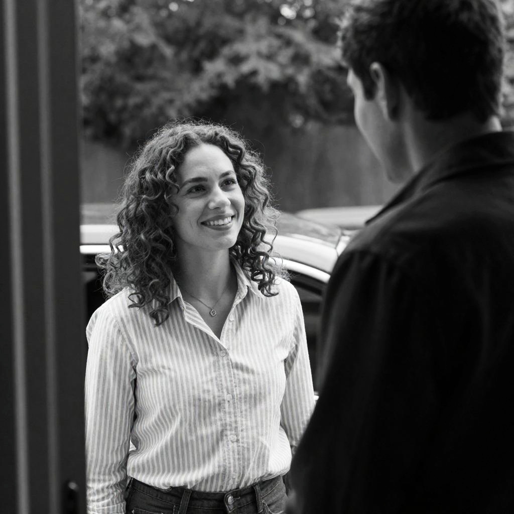 Black and white photograph of two people. Woman with curly hair, wearing striped button-up shirt, smiles facing man with short hair, in dark jacket. Background: car, tree, blurred outdoor setting. Man's back to camera. Doorframe on left. Woman stands in doorway.
