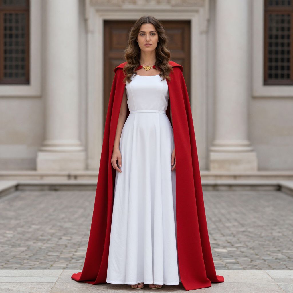 Romans Woman Clothes Costume, a woman in a white dress and red cape standing in front of a building