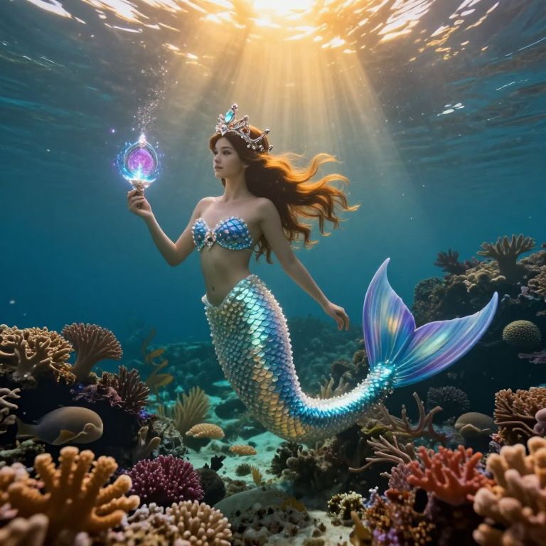 A beautiful mermaid princess with iridescent scales and a jeweled crown glides gracefully underwater above a vibrant coral reef. Sunlight filters through the deep blue sea, illuminating her and the ancient glowing artifact she holds. The scene captures intricate marine flora and fauna from a unique worm's-eye view, evoking an enchanting underwater realm filled with mystery and magic.