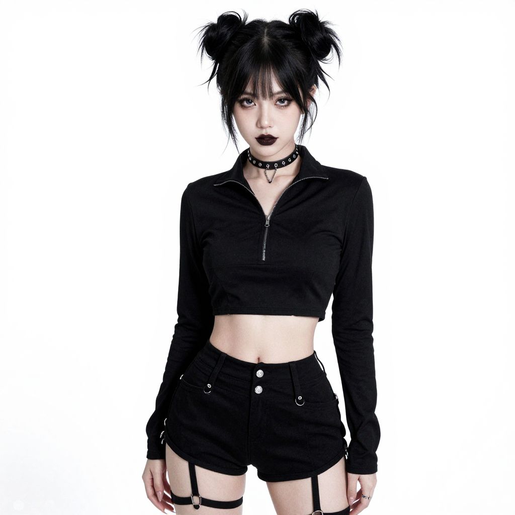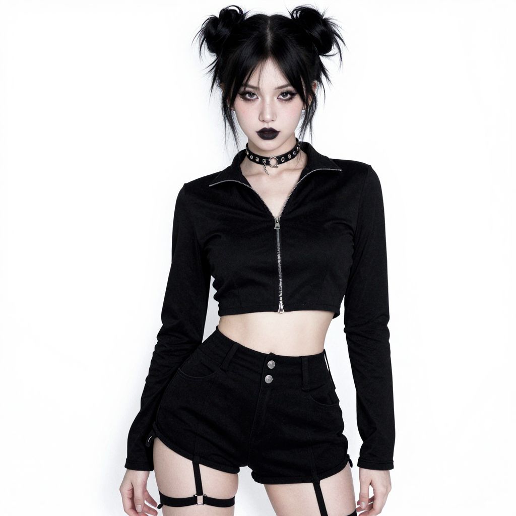 This is a digital image of a pale-skinned, goth-style woman with black hair in two buns, wearing dark lipstick. She's dressed in a black, long-sleeve crop top with a zipper, black high-waisted shorts with a garter strap, and a choker necklace. The background is white, making her outfit and appearance stand out starkly. The image has a slightly grainy, pixelated texture.