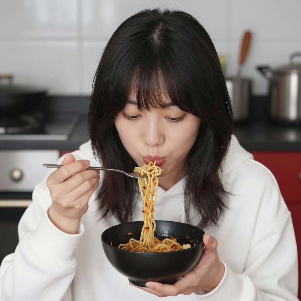Asian woman with straight black hair, wearing a pink button-up shirt, eating with chopsticks, food in mouth, hand on cheek. Restaurant setting, table with bowl, condiments, glass, and bowl with pattern. Brown leather booth, blurred background, warm lighting.