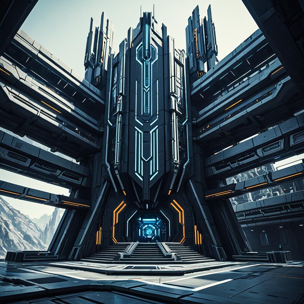 Create concept art for a building called 'Pulse Bastion' in a sci-fi space opera style. The building should showcase grandiose, spear-like geometry and ornamental tech-influences while maintaining a cohesive game world.