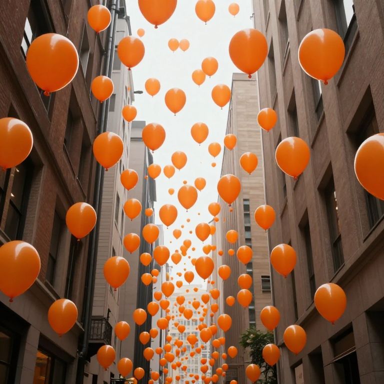 Photograph of a city alleyway lined with tall, gray brick buildings. The alley is filled with numerous bright orange helium balloons, suspended in mid-air, creating a vibrant, floating canopy. The balloons vary in size and are evenly spaced, cascading down the alley from the top center to the bottom. The sky is bright white, contrasting with the dark buildings on either side. The image has a dynamic, festive atmosphere, with the orange balloons adding a pop of color against the urban backdrop.