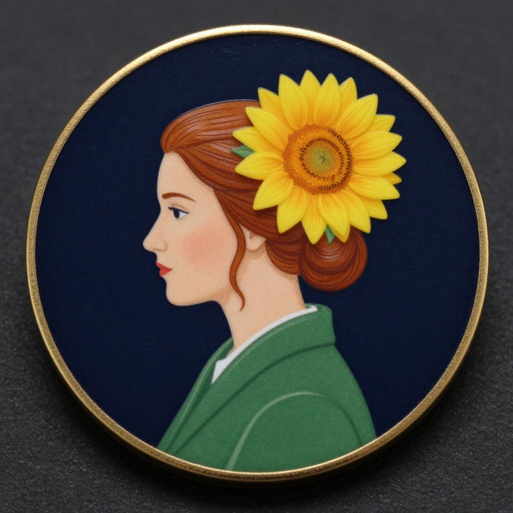 Circular portrait brooch featuring a side-profile illustration of a woman with reddish-brown hair styled in a bun, adorned with a vibrant yellow sunflower, set against a deep navy background, and dressed in a green jacket with a white collar.
