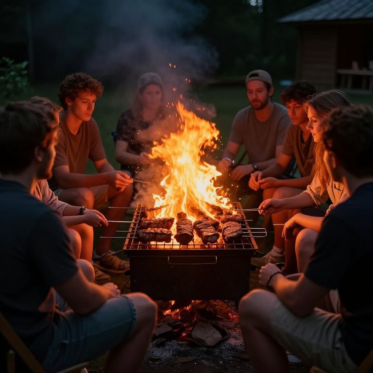 Sitting pose prompt: A diverse group of people from different cultures sit around a fire in a mountain village, sharing stories, hands resting on a wooden table, warm light illuminating their faces in a moment of unity and connection.