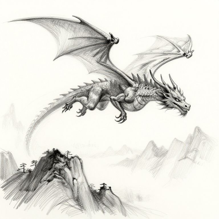 Sketch style fantasy dragon soaring above mountain peaks, emphasizing fluid motion through loose, textured pencil lines and rough shading, combining mythical elements with a hand-drawn artistic approach.