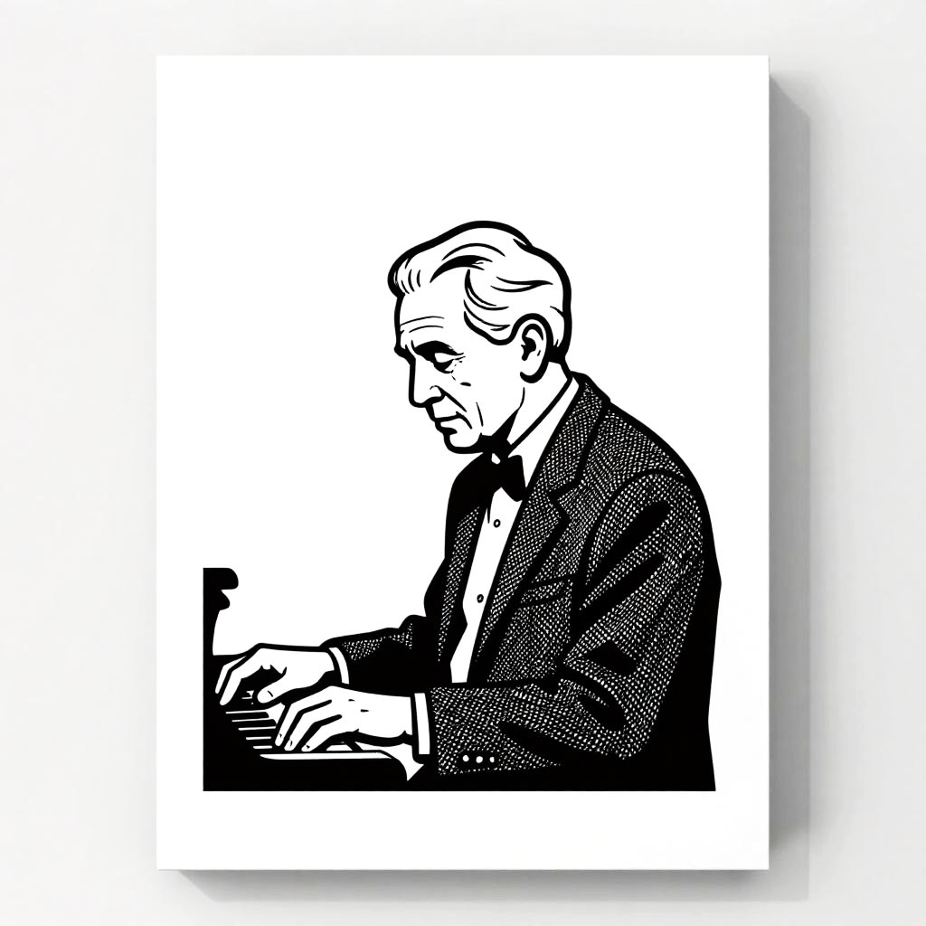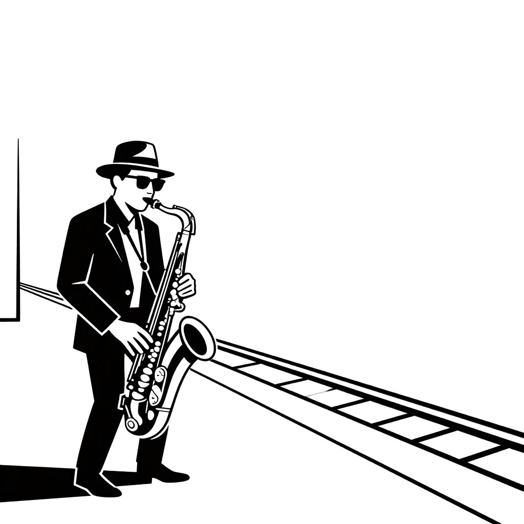 A minimalist line art illustration of a waiter balancing a tray in formal attire, set inside an elegant restaurant with minimalistic interiors, rendered in neat continuous fine black lines, flawless white canvas, no hatching; generous negative space, high contrast, clean vector-like edges, elegant restraint, subtle shadow puddle under the figure, tidy margins, poster-ready simplicity