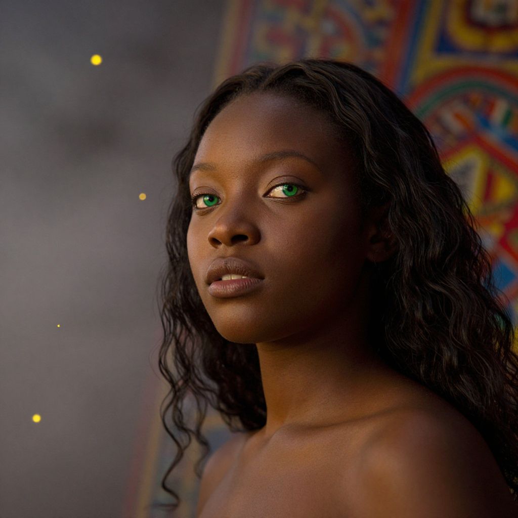 Photograph of a young African-American woman with dark brown skin and striking green eyes, gazing slightly to the right. She has long, wavy black hair that cascades over her shoulders. Her expression is neutral, with slightly parted, glossy lips. She is topless, with her shoulders and upper chest visible. The background is blurred but features colorful, patterned fabric on the right and small, yellow fairy lights on the left, creating a soft, ambient glow. The overall lighting is gentle, highlighting her facial features and creating a serene, intimate atmosphere.