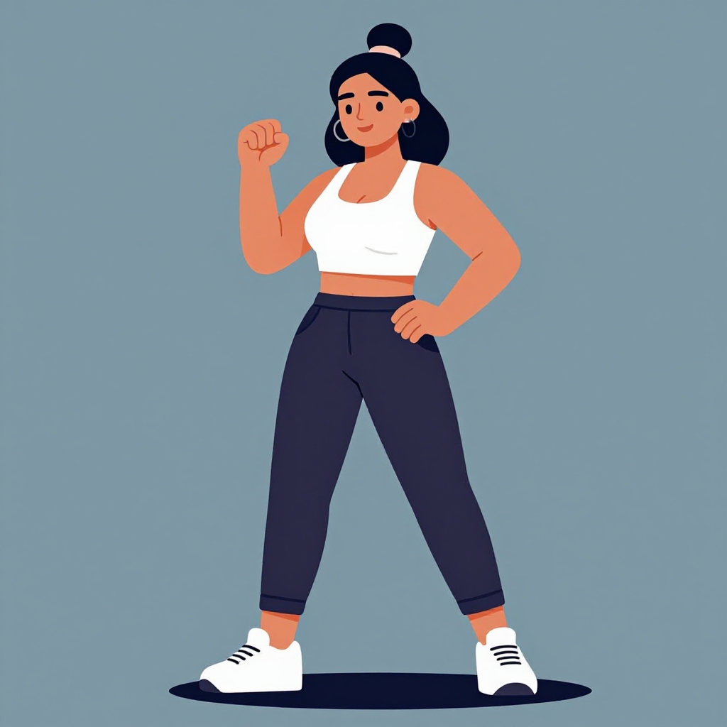 Digital illustration of a confident woman with dark hair in a bun, wearing a white sports bra, dark pants, and white sneakers, standing against a blue