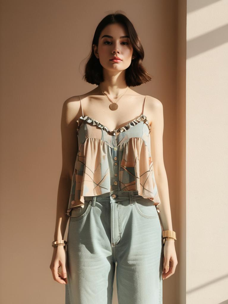 Portrait of a young woman wearing a bohemian-style ruffled camisole with an abstract print in earthy tones, paired with light blue high-waisted jeans. She has a medium skin tone and dark shoulder-length hair. Accessories include a long pendant necklace with a large circular ornament and a chunky wooden bracelet on her wrist. The background is a soft beige wall with natural sunlight casting shadows.