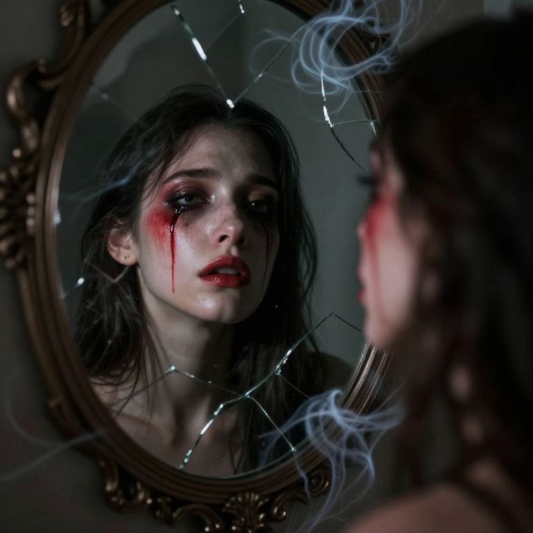 Photograph of a pale, blood-streaked woman with dark, messy hair staring at a broken mirror, reflecting her haunted, red-eyed face.
