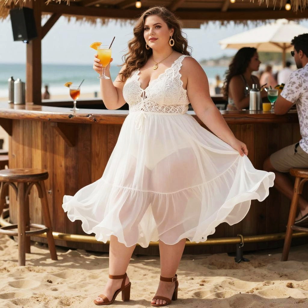 A Plus-size woman, in a romantic bohemian style with a white lace bodice and flowing chiffon midi skirt, stands at a beach bar with cocktails, evoking the vibrant visual style of IDW Publishing. She wears dark brown chunky-heeled sandals with ankle straps, enjoying the lively atmosphere around her. Sexy. Pretty face and beutiful eyes