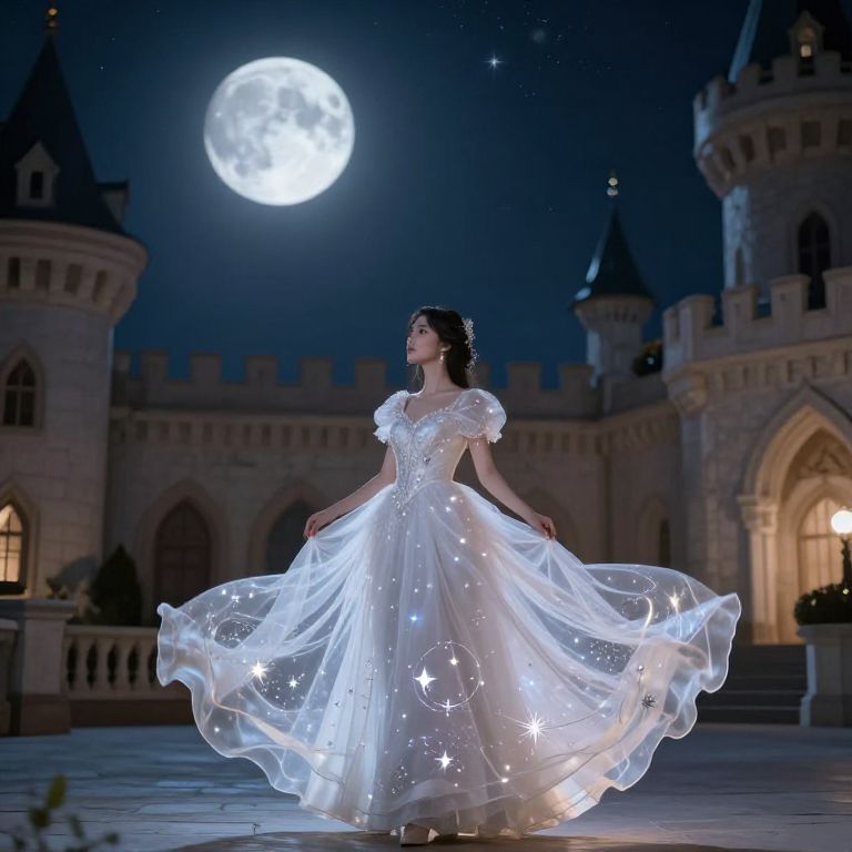 Photograph of a young woman with fair skin and dark hair wearing a glowing, white, full-length ball gown adorned with sparkling star-like lights. She stands in a grand, castle-like courtyard under a night sky illuminated by a bright full moon. The gown's skirt flares out, revealing intricate star patterns. The castle has tall, pointed towers and arched windows, with soft, warm lights inside. The scene is magical and ethereal, with a strong contrast between the dark sky and the luminous moon and gown. The woman gazes upward, her expression serene and dreamy.