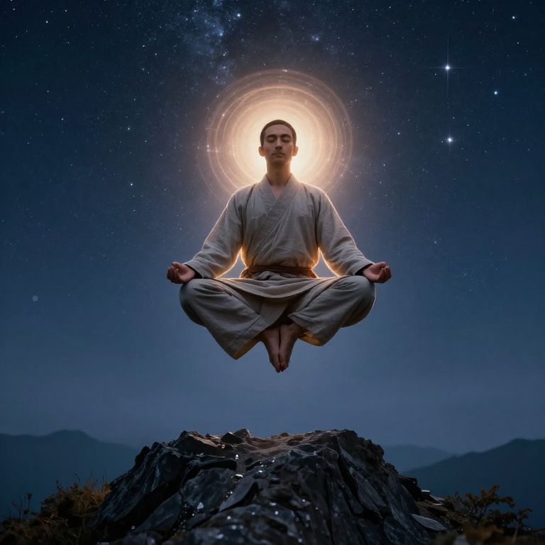 Photograph of a meditating man in a white robe, floating above a rock under a starry night sky, with a glowing halo around his head
