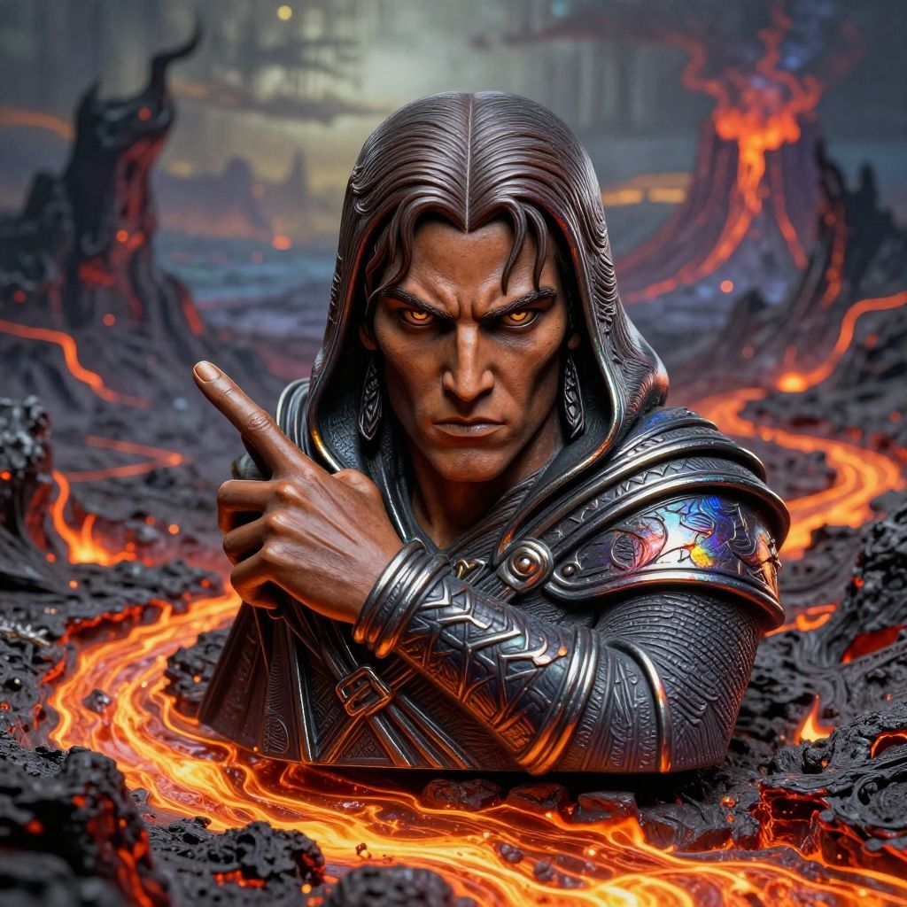 Line art trinket depicting a middle earth, Assassin Striking from the shadows with a deadly precision, Wizard, Short, Sculpted, Square Face, Dark Skin, Dark Brown Hair, amber Eyes, Straight Nose, Thick Lips, Sharp Chin, Ducktail, Long, Undercut, A volcanic wasteland, with rivers of fire flowing into a molten sea, Tolkien Elisa Breton, natural, shimmering, vibrant, gothic, rpg, 1400ad, ultra detailed, detailed, immersive, reminiscent of high fantasy RPG games, HD, masterpiece, best quality, hyper detailed, super realistic, perfect face, perfect hands, award-winning, professional, breathtaking, linquiveratemperate Swampdreamy weatherethereal fantasy concept art of . magnificent, celestial, ethereal, painterly, epic, majestic, magical, fantasy art, cover art