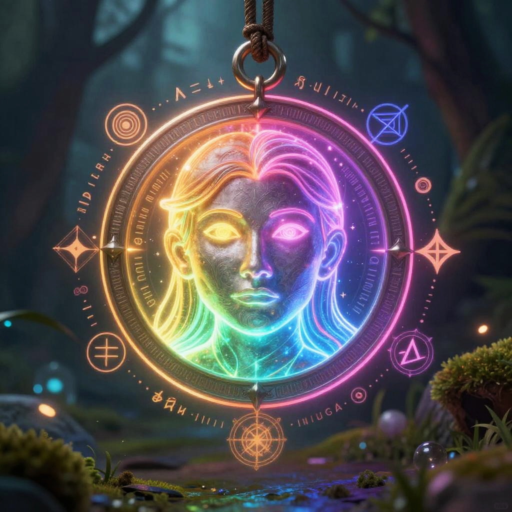Expression changer portrayed as magical artifact, ancient glowing amulet emitting multicolored energy that transforms human expressions, surrounded by mystical symbols and floating runes, fantasy environment with enchanted forest background