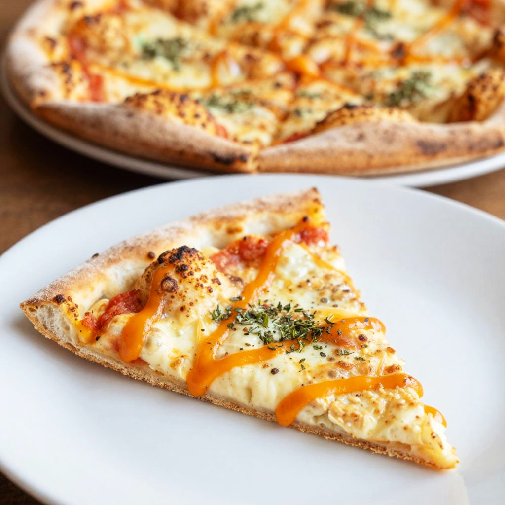 A close-up photo of a single slice of pizza on a white plate, with a blurred background of a whole pizza. The slice has a golden-brown crust, a creamy white base, and is topped with a vibrant orange sauce and scattered herbs. The background pizza has similar toppings and is slightly out of focus, emphasizing the foreground slice.