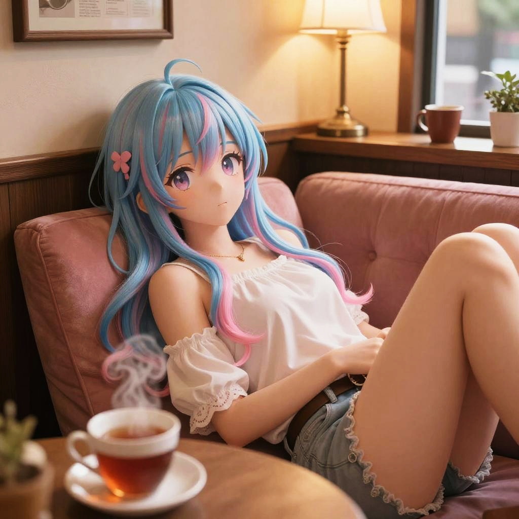 Blue and pink hair anime girl lounging in a cozy vintage cafe, warm ambient lighting, steaming cup of tea on the table, soft plush cushions, retro decor with pastel tones, relaxed and charming expression, intricate hair highlights and shadows