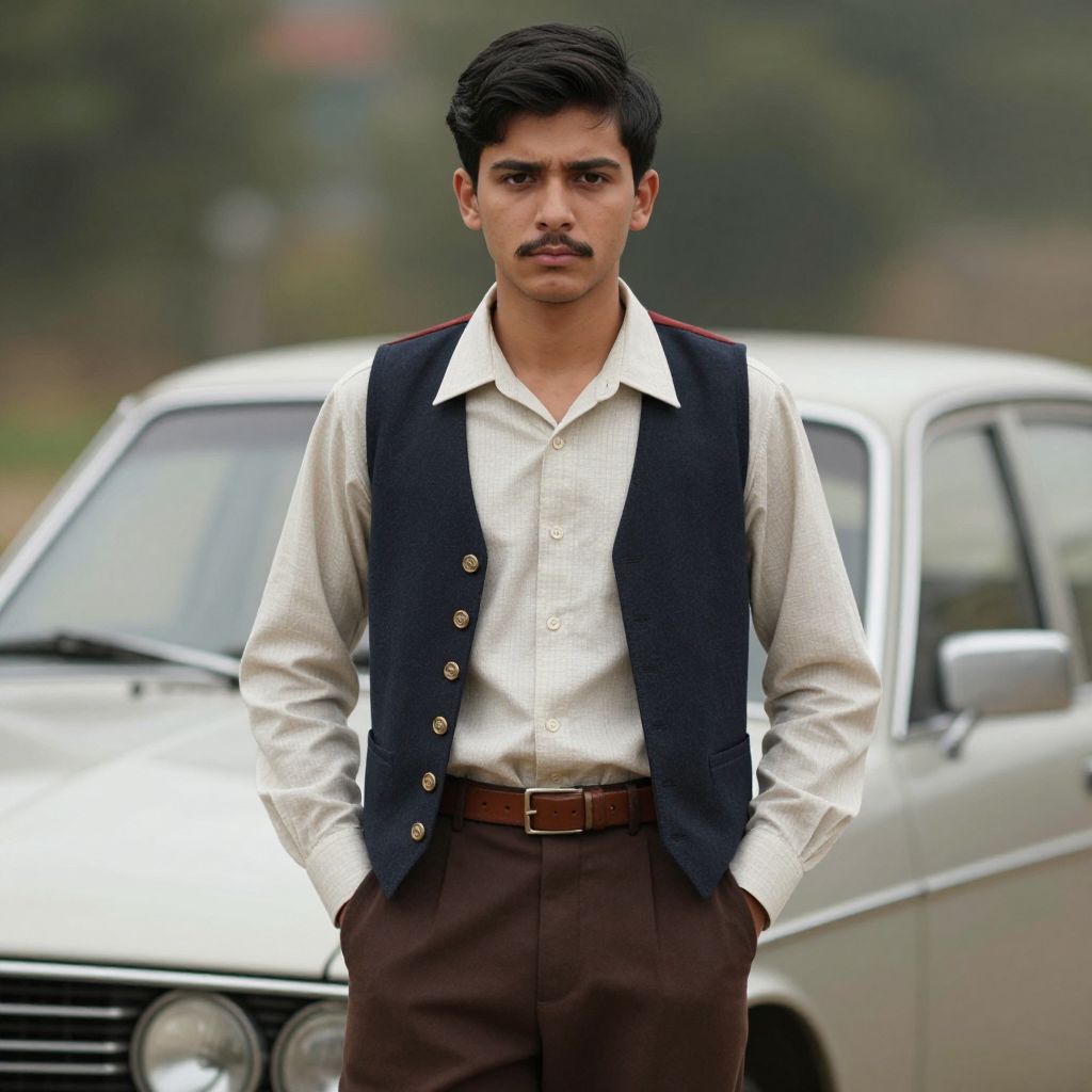 Retro vintage outfit male, 1boy, male focus, facial hair, shirt, solo, blurry background, belt, blurry, hands in pockets, mustache, collared shirt, black hair, looking at viewer, standing, brown pants, realistic, short hair, vest, motor vehicle, brown belt