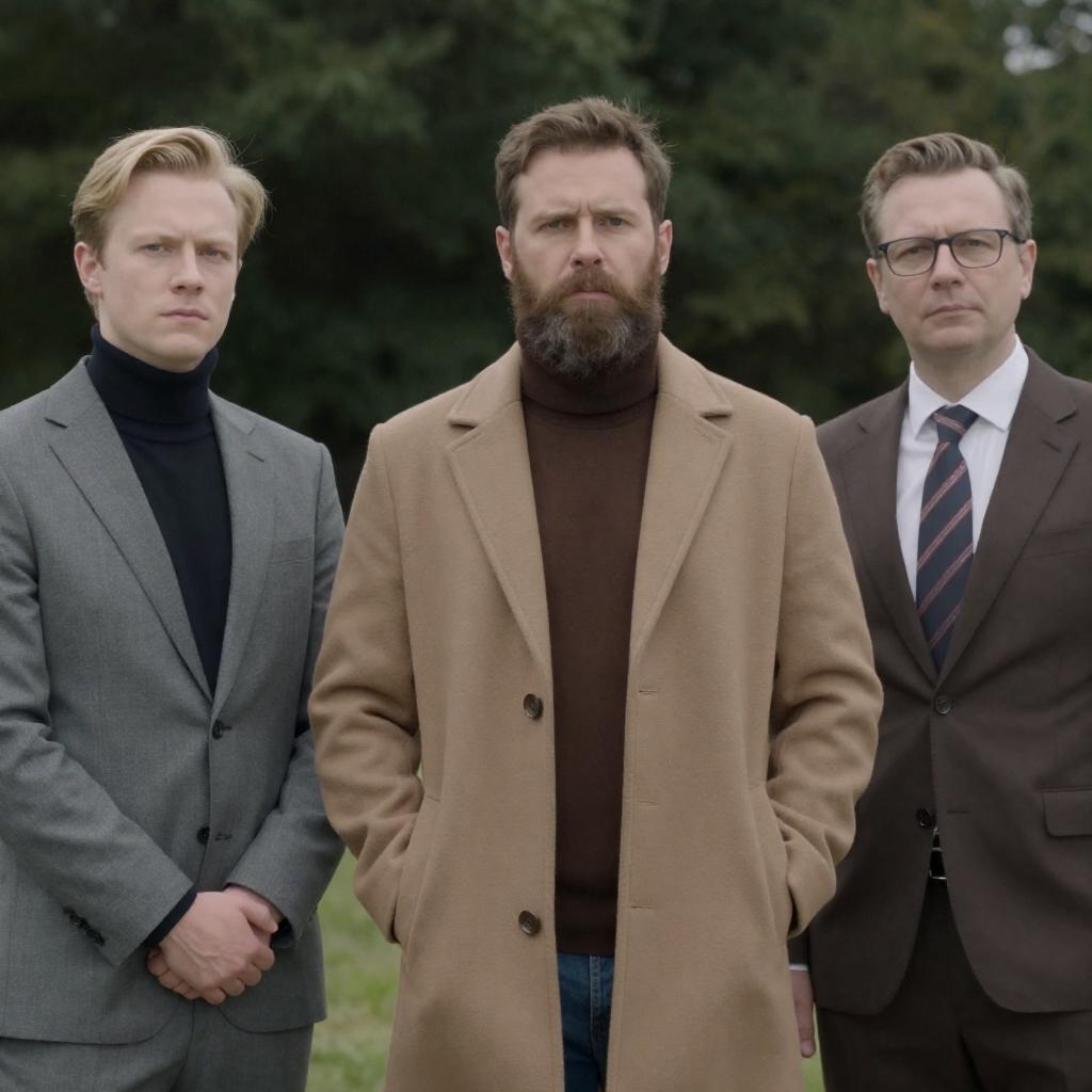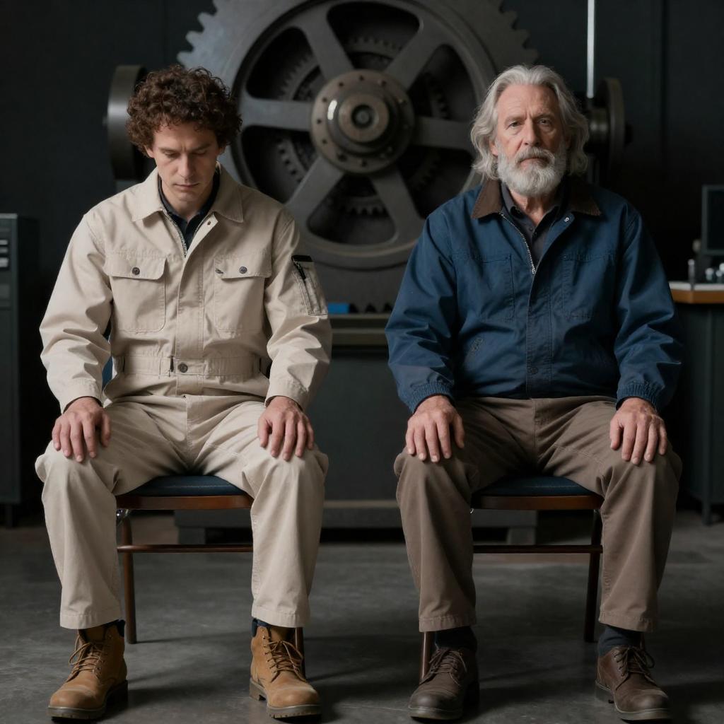 Photograph of two men standing beside a red vintage car with both doors open. Man on left has gray beard, gray jacket, and floral shirt, leaning on car door. Man on right has blond hair, black jacket, white shirt, holding car mirror. Forest background, overcast sky. Car has large front grille, round headlights, and chrome accents.