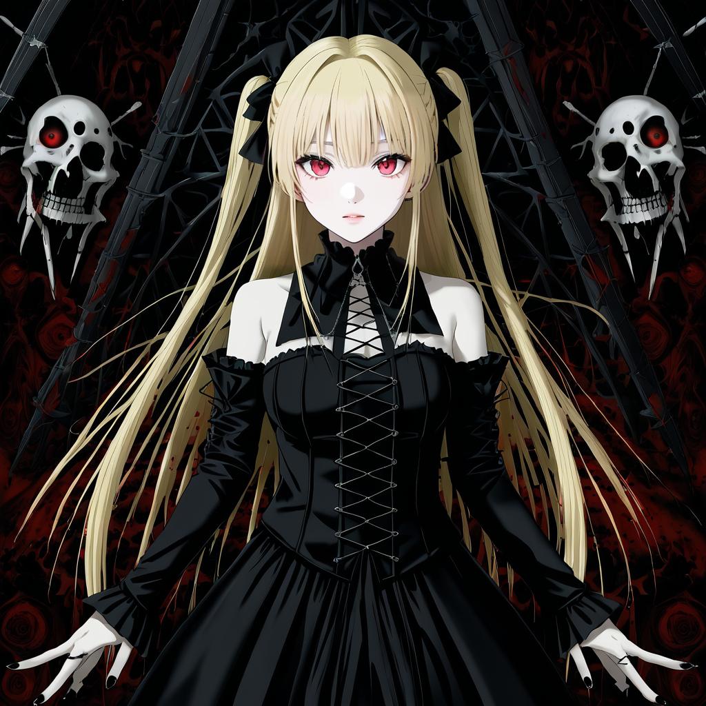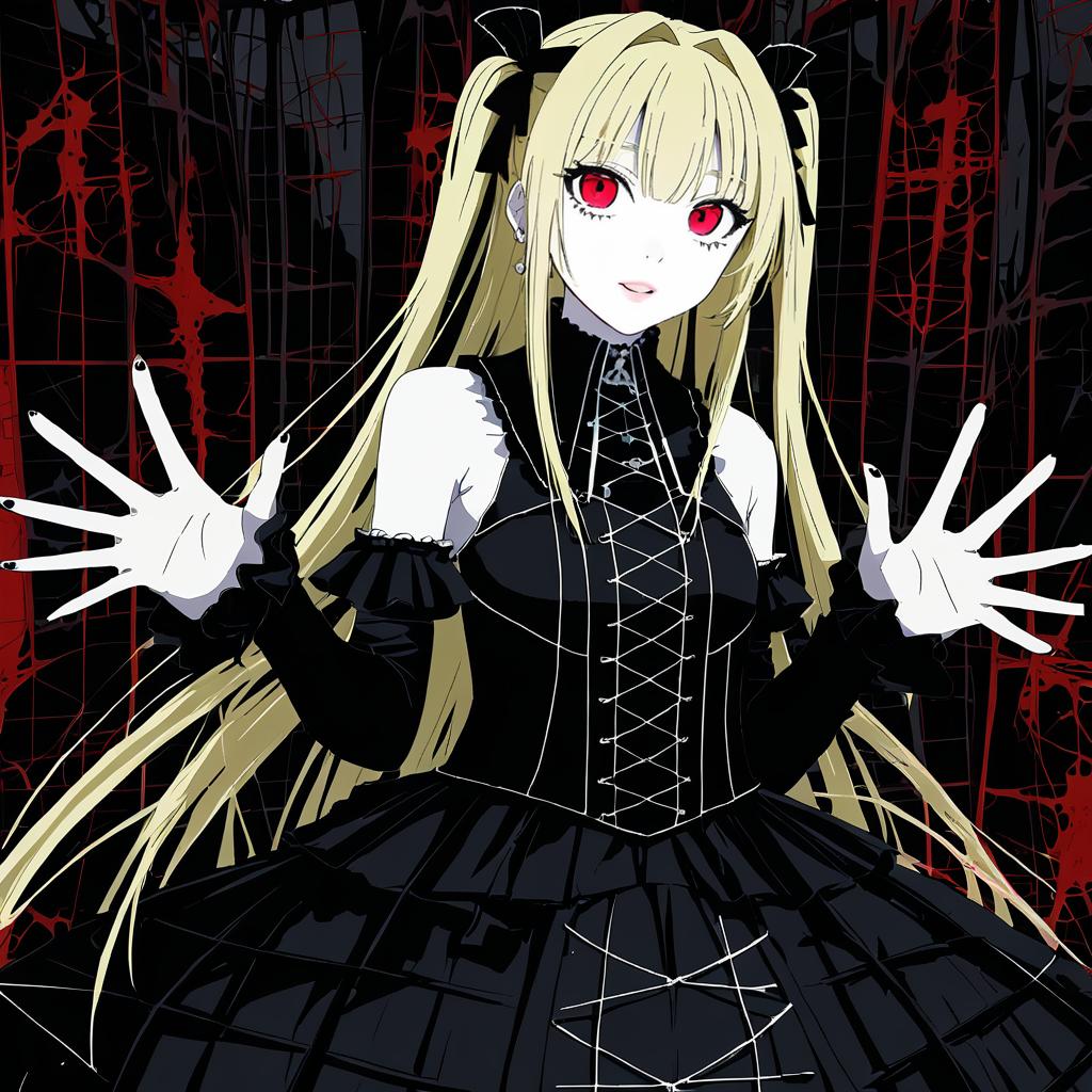 Amane misa, death note, 1girl, red eyes, blonde hair, long hair, two side up, medium breasts, black dress, bare shoulders, detached sleeves, nail polish, goth fashion, goth fashion, by artist shichimenchou, illustrious