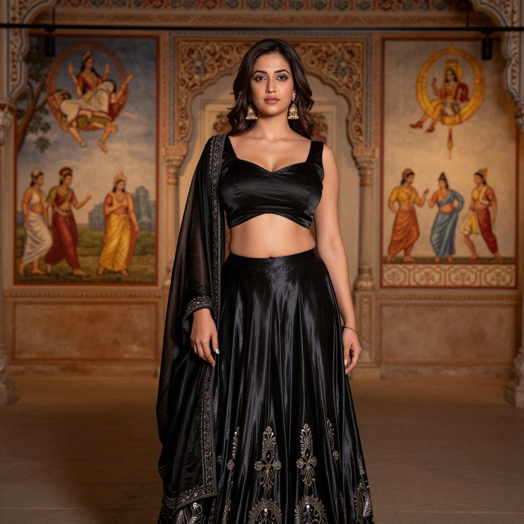 Photograph of a curvy South Asian woman with medium-brown skin and black shoulder-length hair, wearing a black, sleeveless, velvet crop top and a long, black, pleated skirt with intricate gold embroidery. She has red lipstick, dark eye makeup, and wears gold earrings and a bracelet. She stands confidently in a traditional, ornately decorated room with two painted murals on either side depicting mythological figures. The background features arches and intricate carvings, highlighting cultural and religious art. The lighting is warm, casting a soft glow on her and the surroundings.
