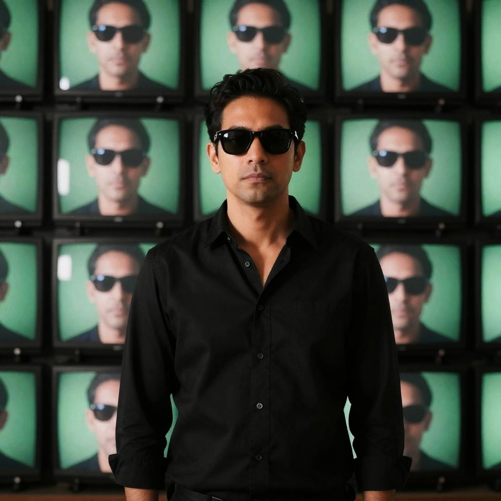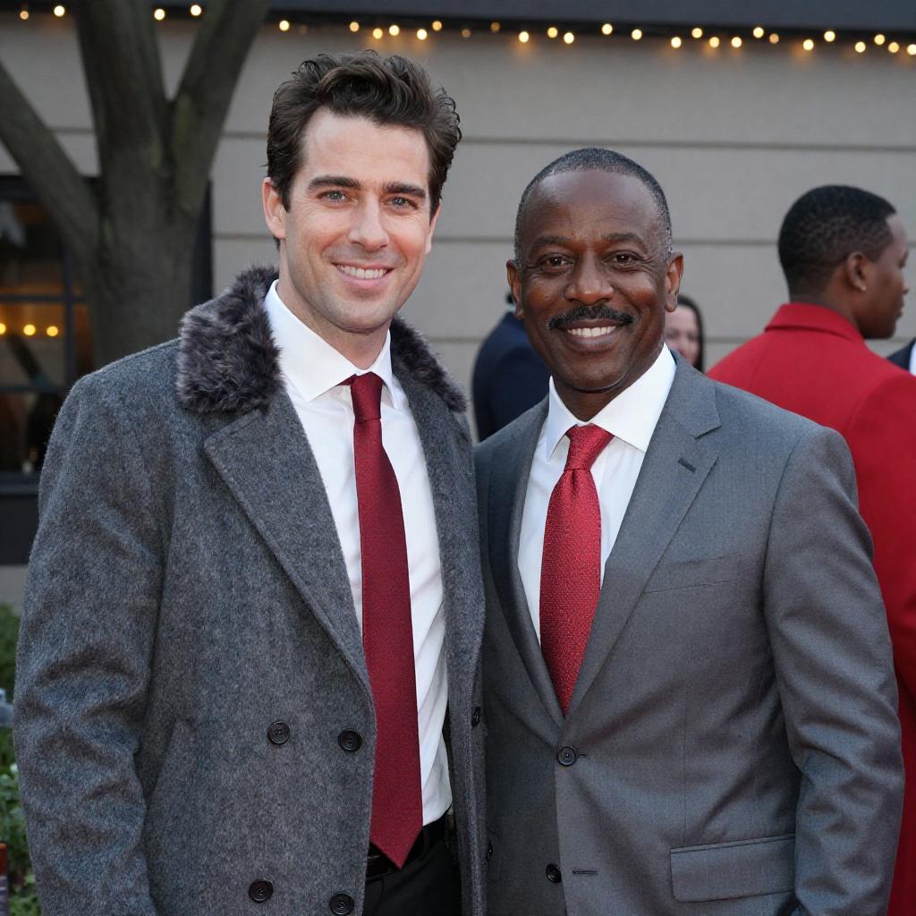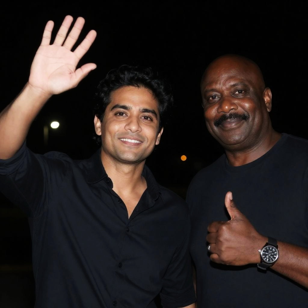 Photograph of two men. The man on the left has light skin, dark hair, and is waving his right hand. He wears a dark shirt. The man on the right has dark skin, bald head, mustache, and is giving a thumbs-up. He wears a dark shirt and a watch. Both men are smiling. Background is dark with faint lights.