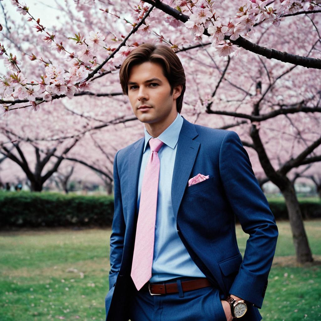 Portrait of a young man with brown hair wearing a blue suit, light blue collared shirt, and pink necktie standing outdoors among blooming cherry blossom trees. The man has a serious expression, hands in pockets, and is accessorized with a brown leather belt, pink pocket square, and wristwatch. The scene captures the contrast between formal attire and natural spring background.