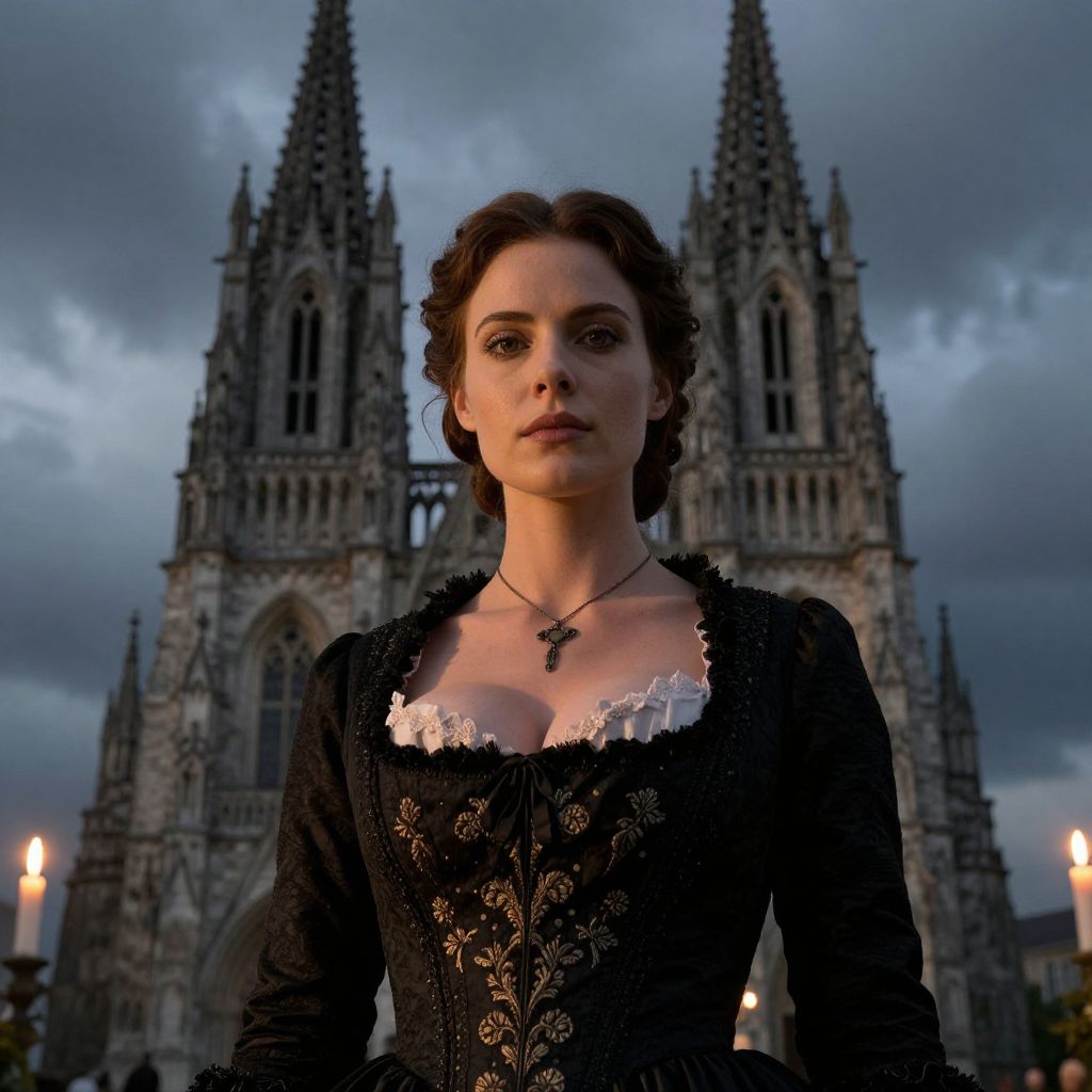 A cinematic shot of a woman with sharp features, almond-shaped eyes, and a regal expression wearing a black Victorian dress with intricate embroidery, standing in front of a grand gothic cathedral at twilight, her silhouette framed by candlelight and stormy skies, during a period film scene.. The woman has big tits and cute face