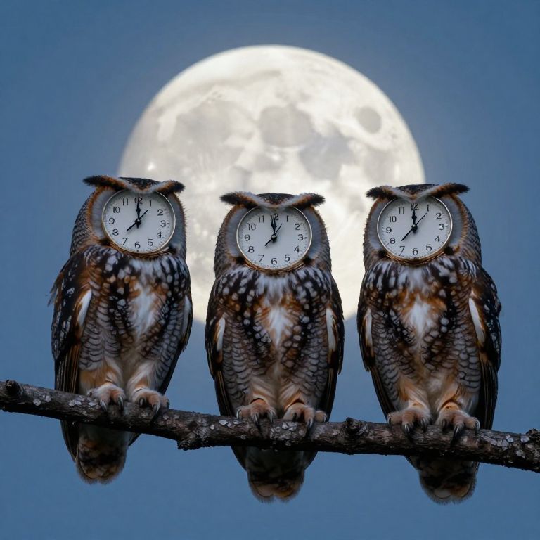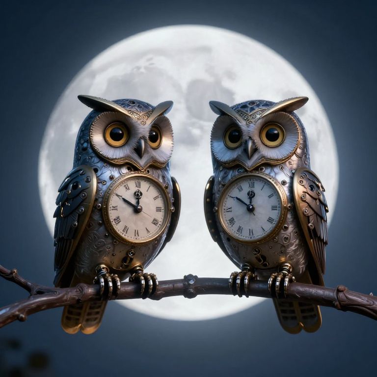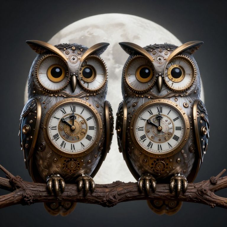 Owls with clock faces for heads perch serenely on a branch against the backdrop of a luminous moon, merging the natural world with the mechanical precision of timekeeping in a surreal, dreamlike tableau.