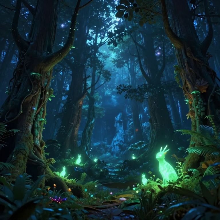 Generadas bioluminescent forest at night, trees and plants emitting soft glowing light, mystical creatures lurking, high fantasy setting, rich blue and green hues, magical and serene atmosphere, ultra-detailed render.