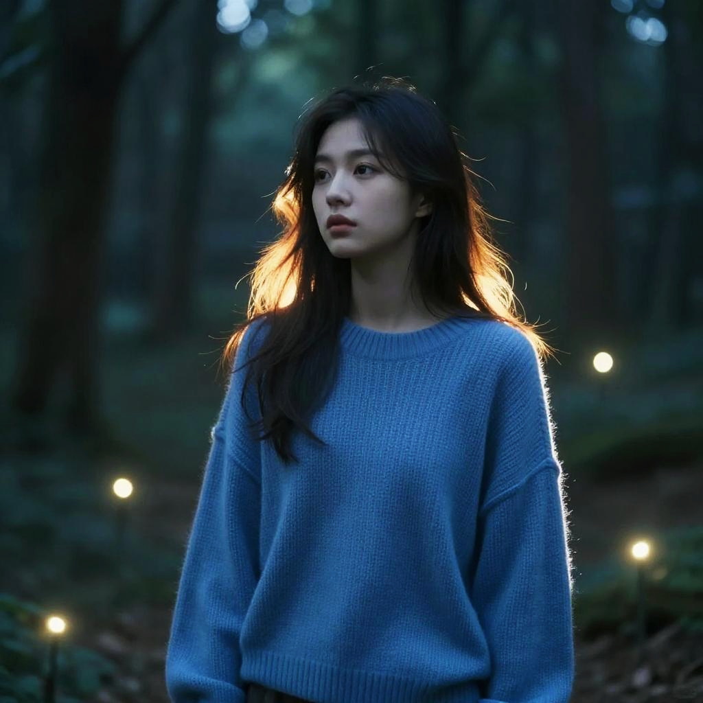 Photograph of an Asian woman with long dark hair, wearing a white fuzzy sweater, standing against a vibrant autumn background with yellow leaves.