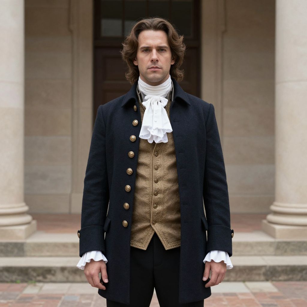 Photograph of a Caucasian man with wavy brown hair standing in front of a classical building with columns. He wears an 18th-century-style outfit: a dark navy coat with gold buttons, a brown waistcoat, white ruffled shirt, and black trousers. His expression is serious, and he stands centered, facing the camera. The background includes a stone pavement and a dark wooden door. The image has a historical, formal aesthetic.