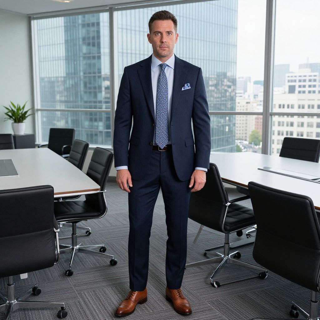 A man, tailored navy suit with subtle pinstripes, light blue dress shirt, patterned silk tie in shades of blue, brown leather brogues, matching pocket square, modern glass skyscraper, sleek conference rooms, panoramic city views, candid shot, confident expression. Man has masculine face and piercing eyes