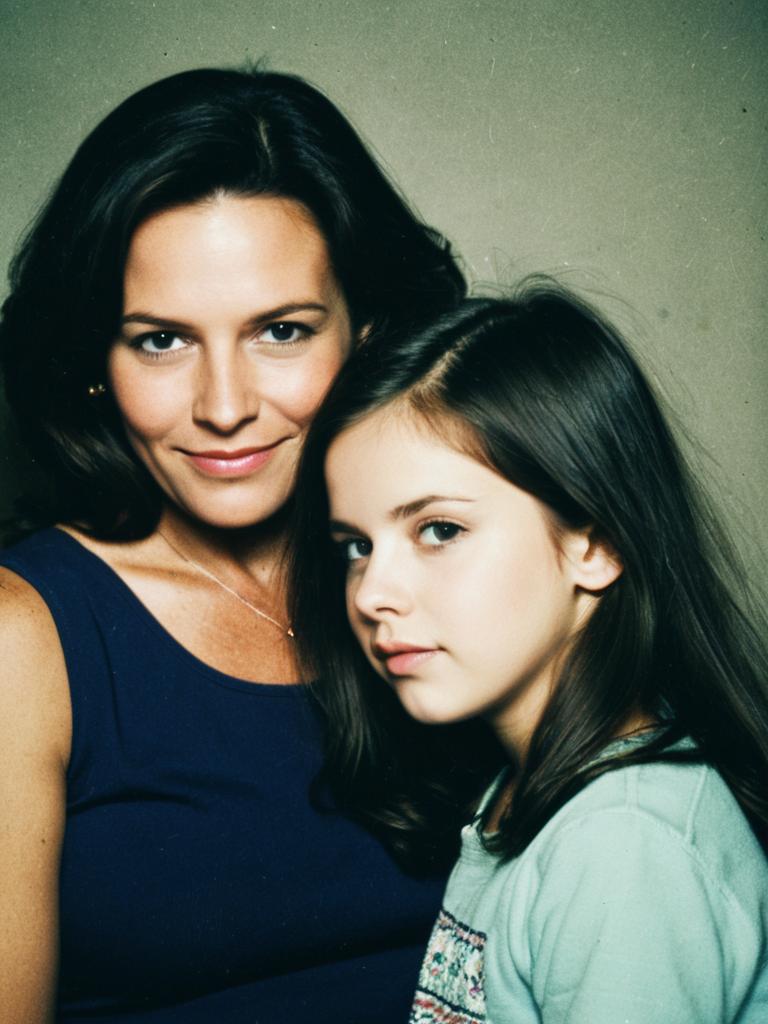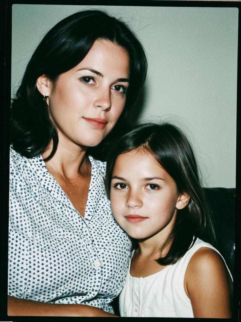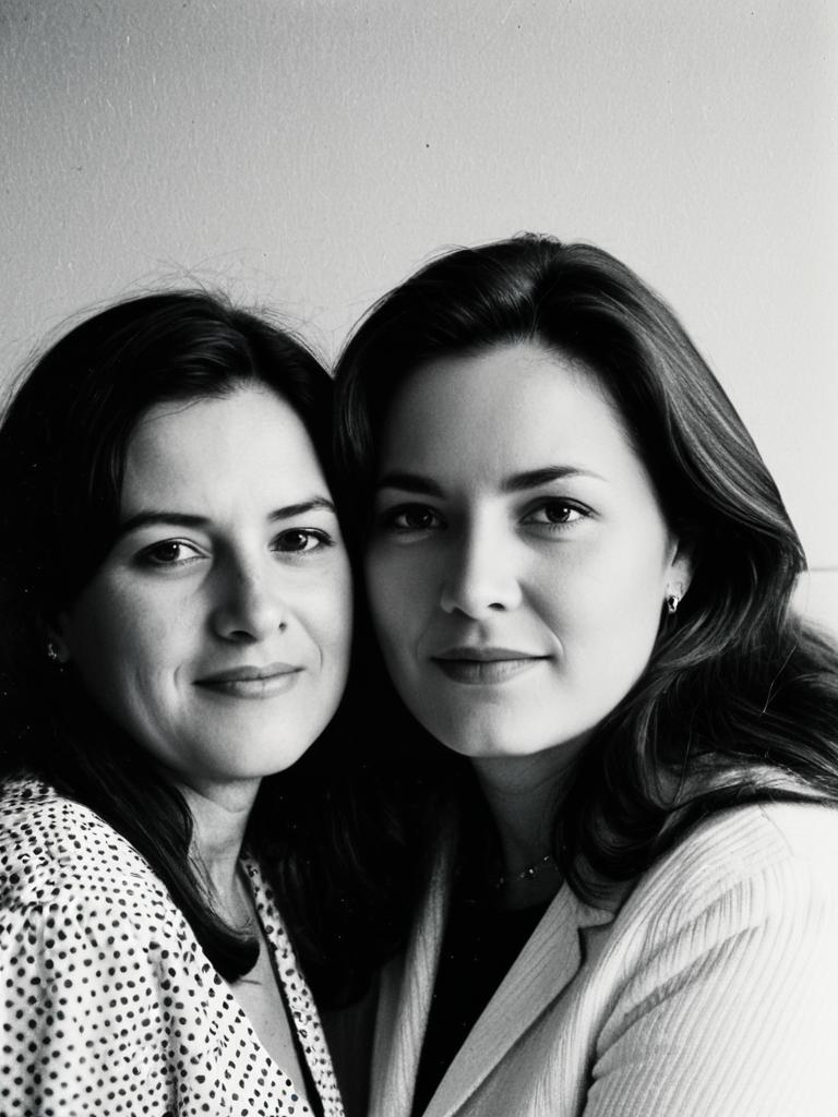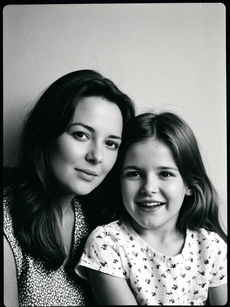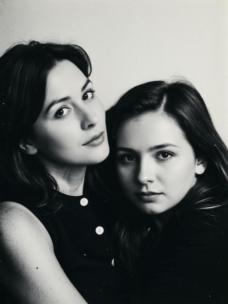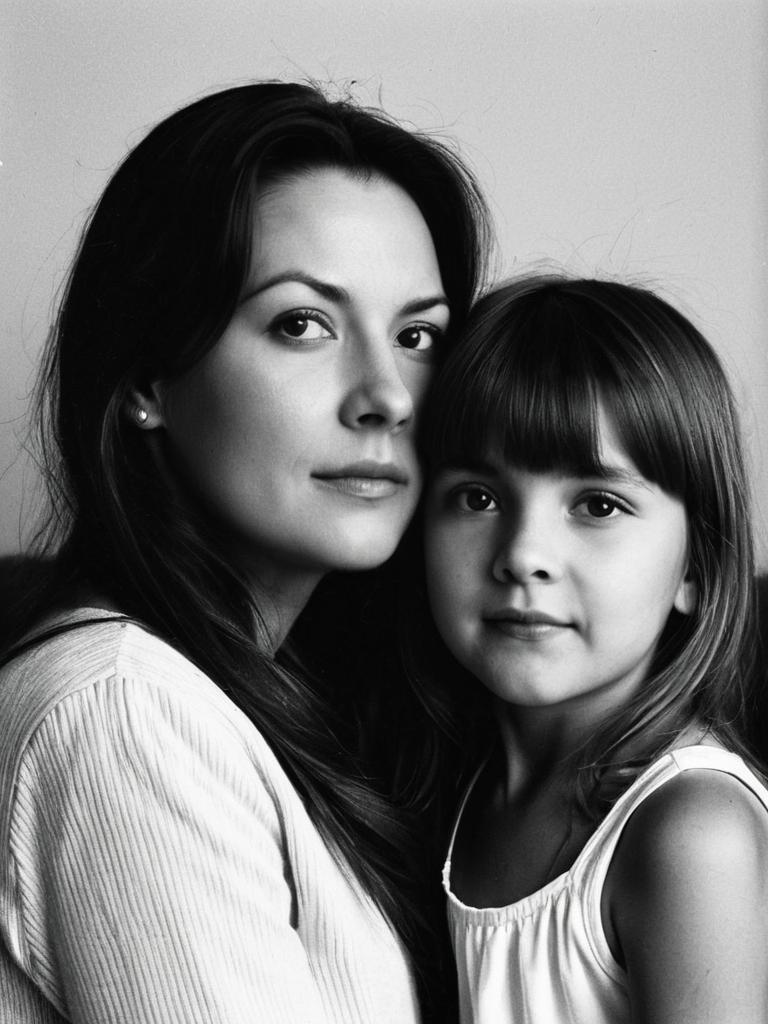 Black and white close-up portrait of a mother and her young daughter. Both are facing the camera with neutral expressions. The mother has long dark hair, light skin tone, and wears a light-colored top, while the daughter has straight hair with bangs and wears a sleeveless top. The background is plain and out of focus, emphasizing the subjects' faces.