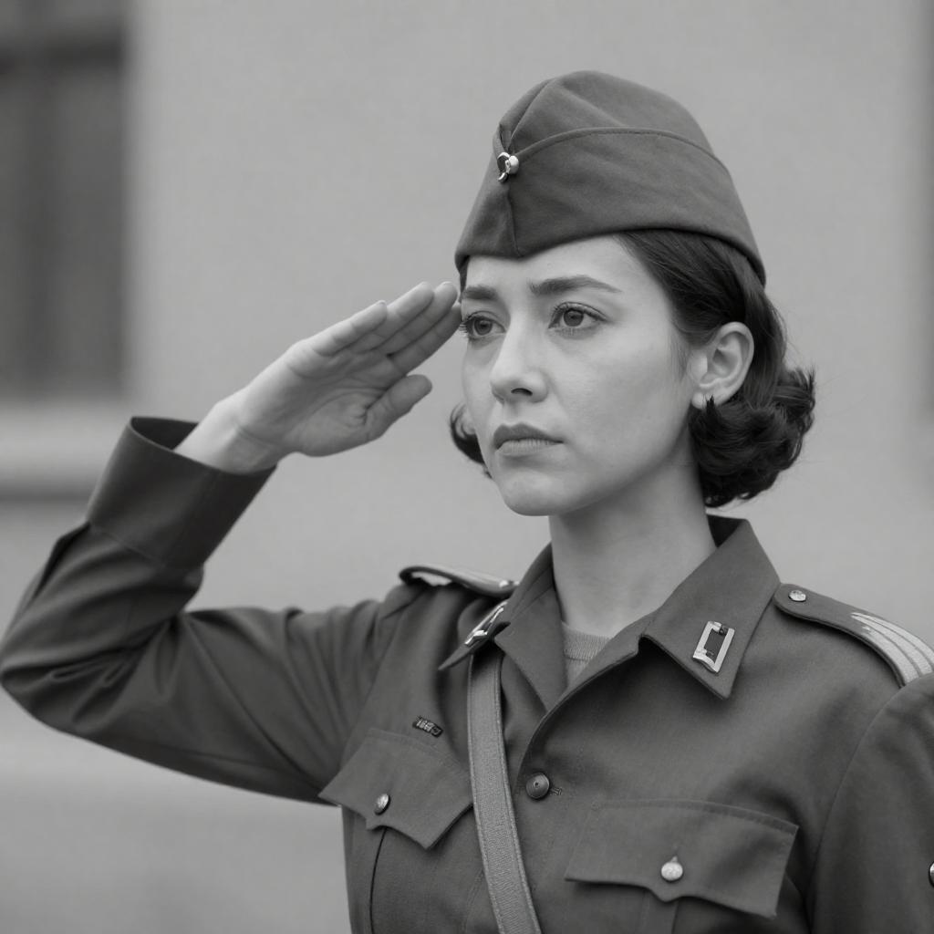 Black-and-white photograph of a woman in a military-style uniform and cap, saluting with her right hand. She has short, wavy hair, intense eyes, and a serious expression. Background is a ured, blurry wall. She wears a glove on her right hand.
