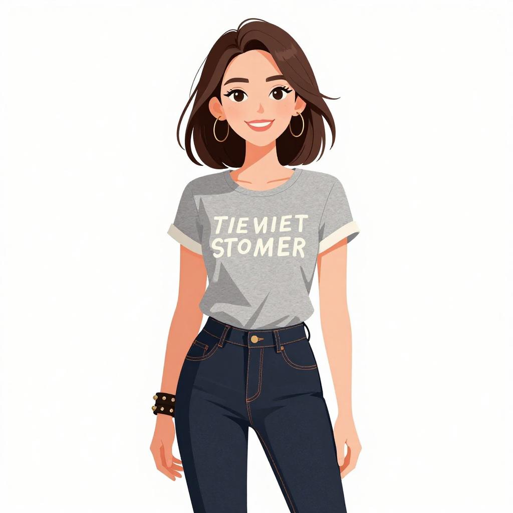 This digital illustration features a smiling woman with fair skin and shoulder-length brown hair. She wears a light gray, short-sleeved T-shirt with white text reading "TIEMVIER STOMER." Her dark blue jeans have visible stitching and a gold button. She accessorizes with large silver hoop earrings and a black wristband with silver spikes on her right wrist. The background is plain white, making her the focal point. The illustration style is clean and modern, with bold colors and smooth lines.