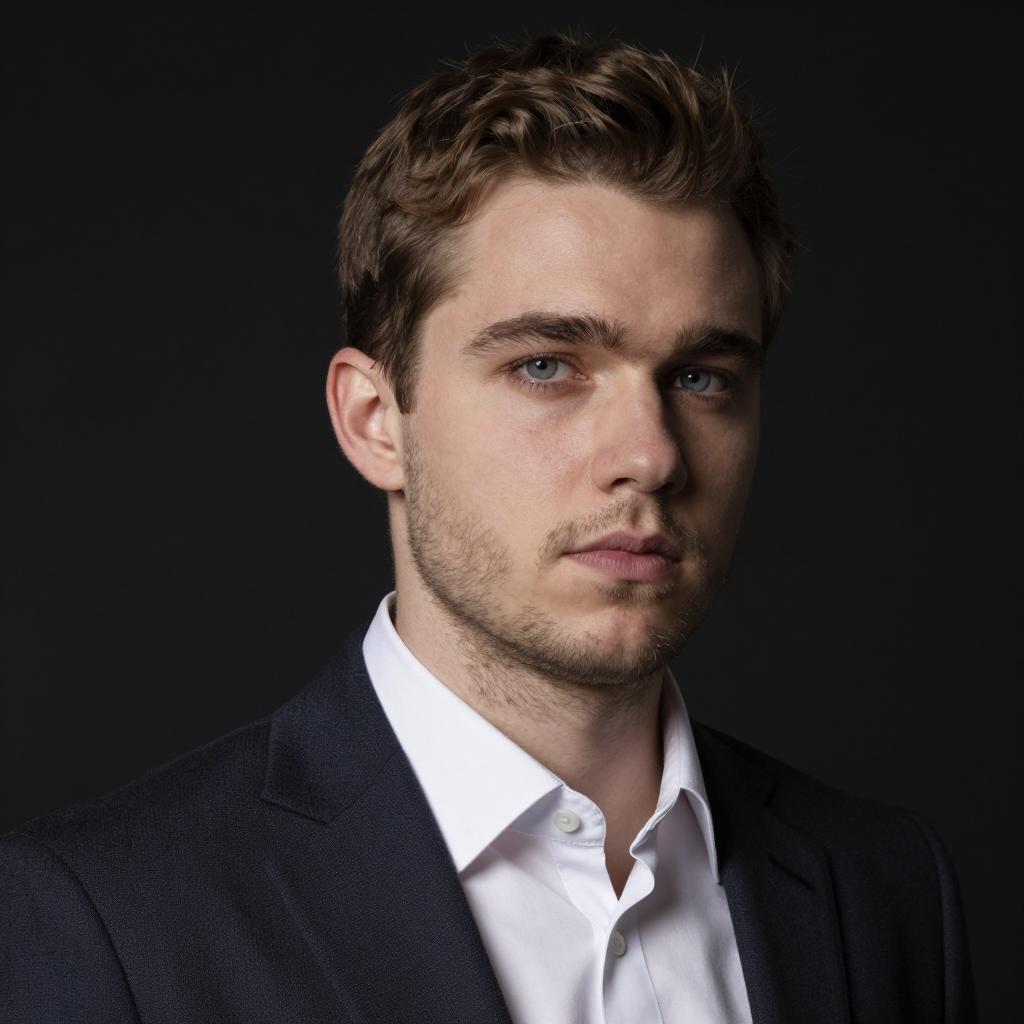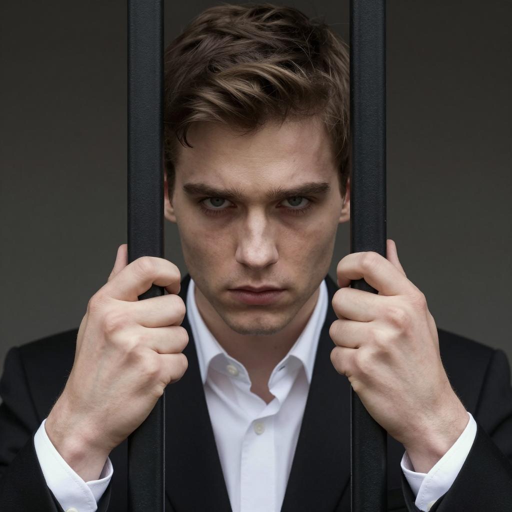Young man with brown hair, blue eyes, and striped shirt, holding tree branch with both hands, in dark forest with green leaves. Background shows blurred tree branches and leaves. Intense, focused facial expression.