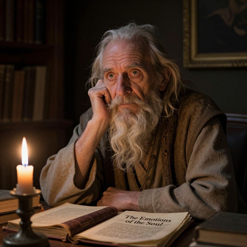 An ultra-realistic portrait depicts a weathered yet wise old sage, his wrinkled face illuminated by flickering candlelight in a secluded library. Soft light casts long shadows across ancient manuscripts and reveals a rare first edition titled 'The Emotions of the Soul.' Framed by dim surroundings, the sage's intense gaze transcends time as he contemplates human emotion, evoking profound introspection.