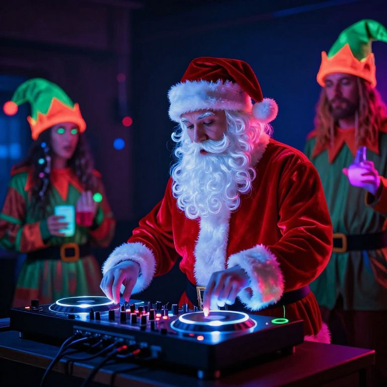 A psychedelic Christmas scene with a neon Santa as a disc jockey, hippie elves, and blacklight-style effects.