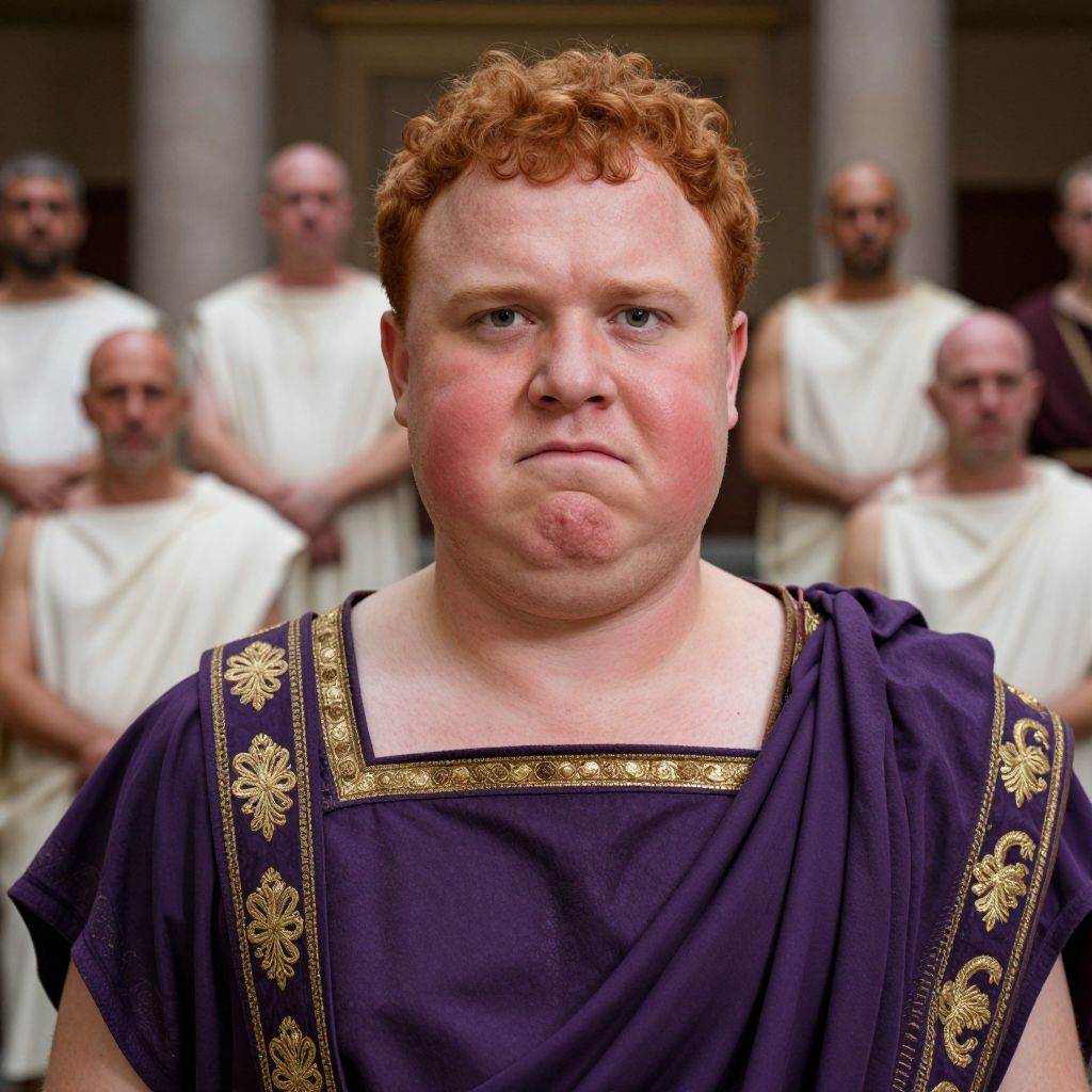 Photograph of a plus-sized, fair-skinned man with red, curly hair, wearing a deep purple Roman-style tunic with gold trim. His expression is serious and slightly pouty. He stands in the foreground, slightly centered, with blurred, bald men in white togas in the background. The setting appears to be an ancient-style building with stone columns. The lighting is natural, highlighting the man's pale skin and the rich colors of his attire. The image has a slightly exaggerated, almost caricature-like quality, emphasizing the man's facial features and expression.